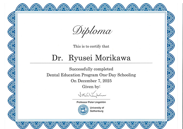 ドイツ口腔インプラント学会(DGZI)のスペシャリスト資格(国際指導医)は、インプラント治療における高度な技術と知識を持つ証明であり、患者さまに安心と信頼を提供します。この資格を持つ歯科医師は、厳しいトレーニングと試験を経て最先端の治療法を習得し、安全で質の高い治療を提供します。